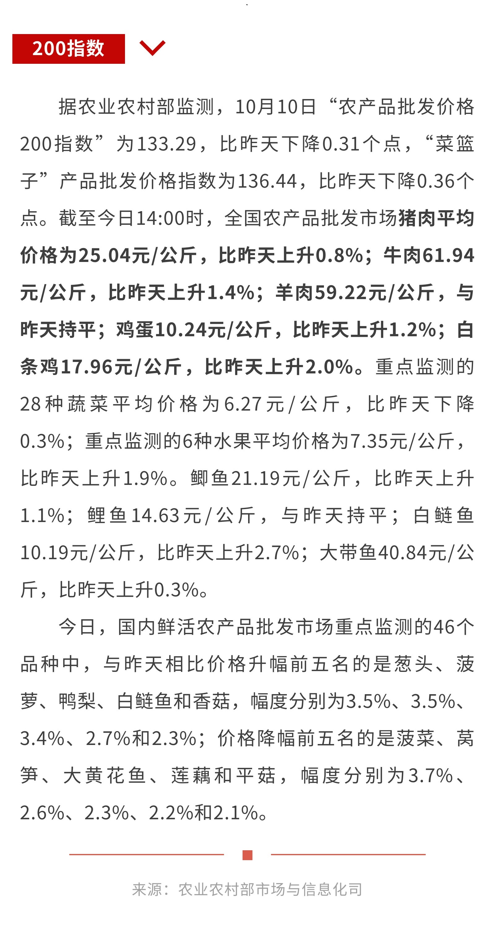 10月10日:“农产品批发价格200指数”比昨天下降0.31个点