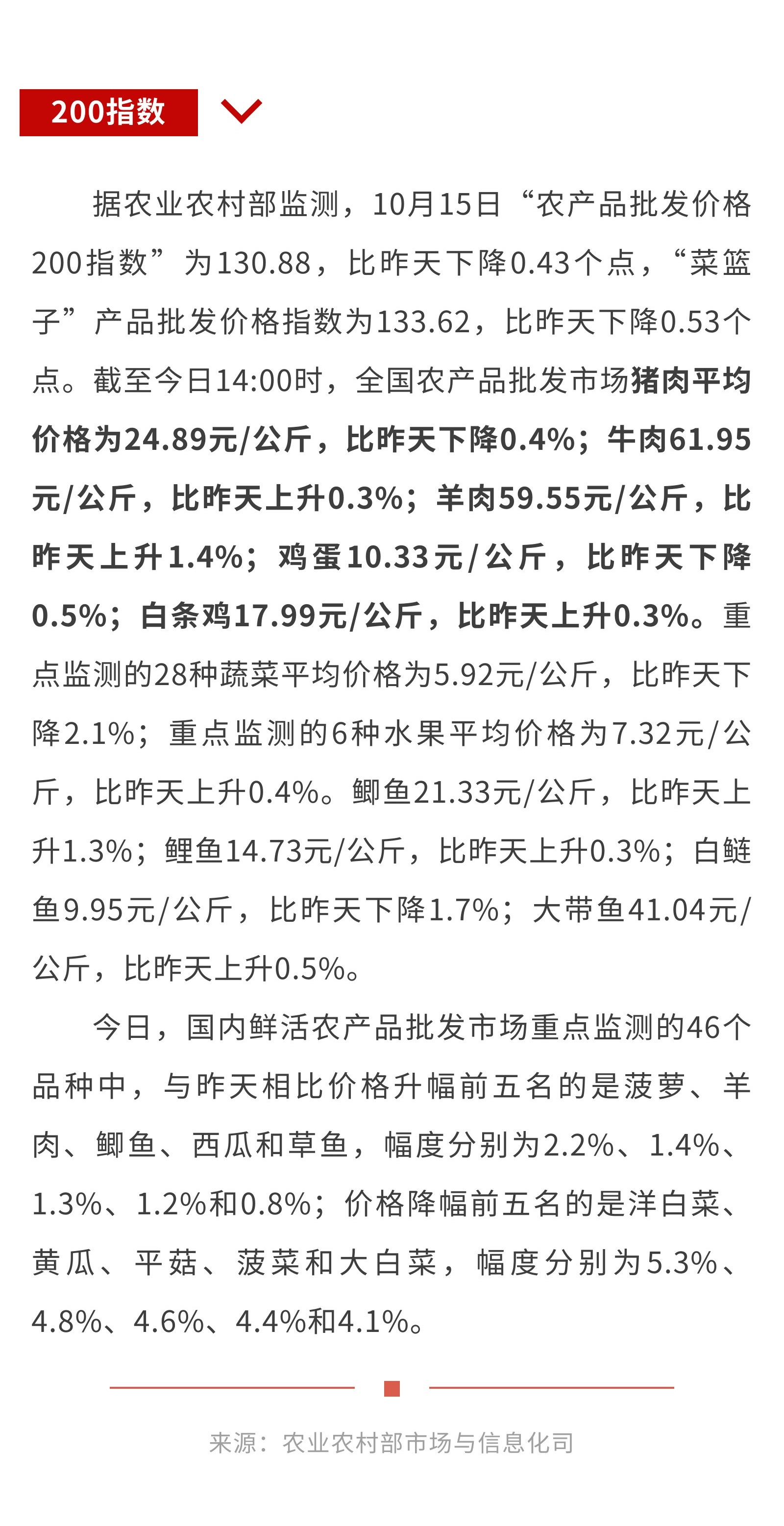 10月15日:“农产品批发价格200指数”比昨天下降0.43个点