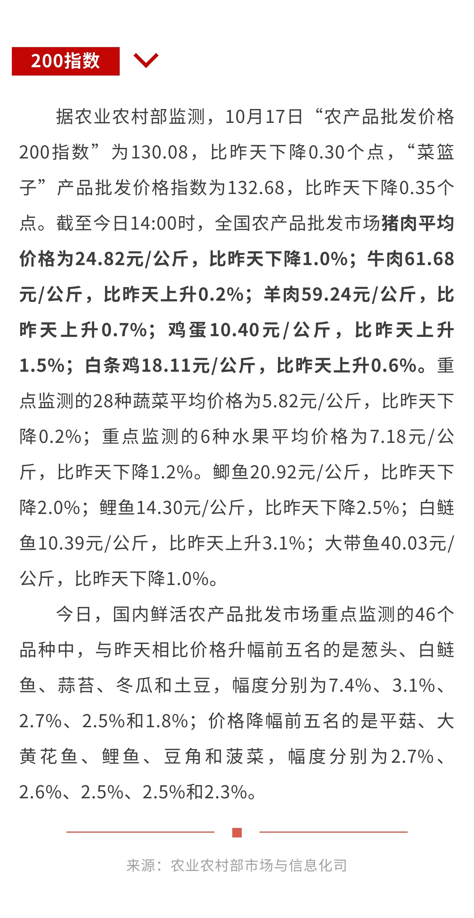 10月17日:“农产品批发价格200指数”比昨天下降0.30个点