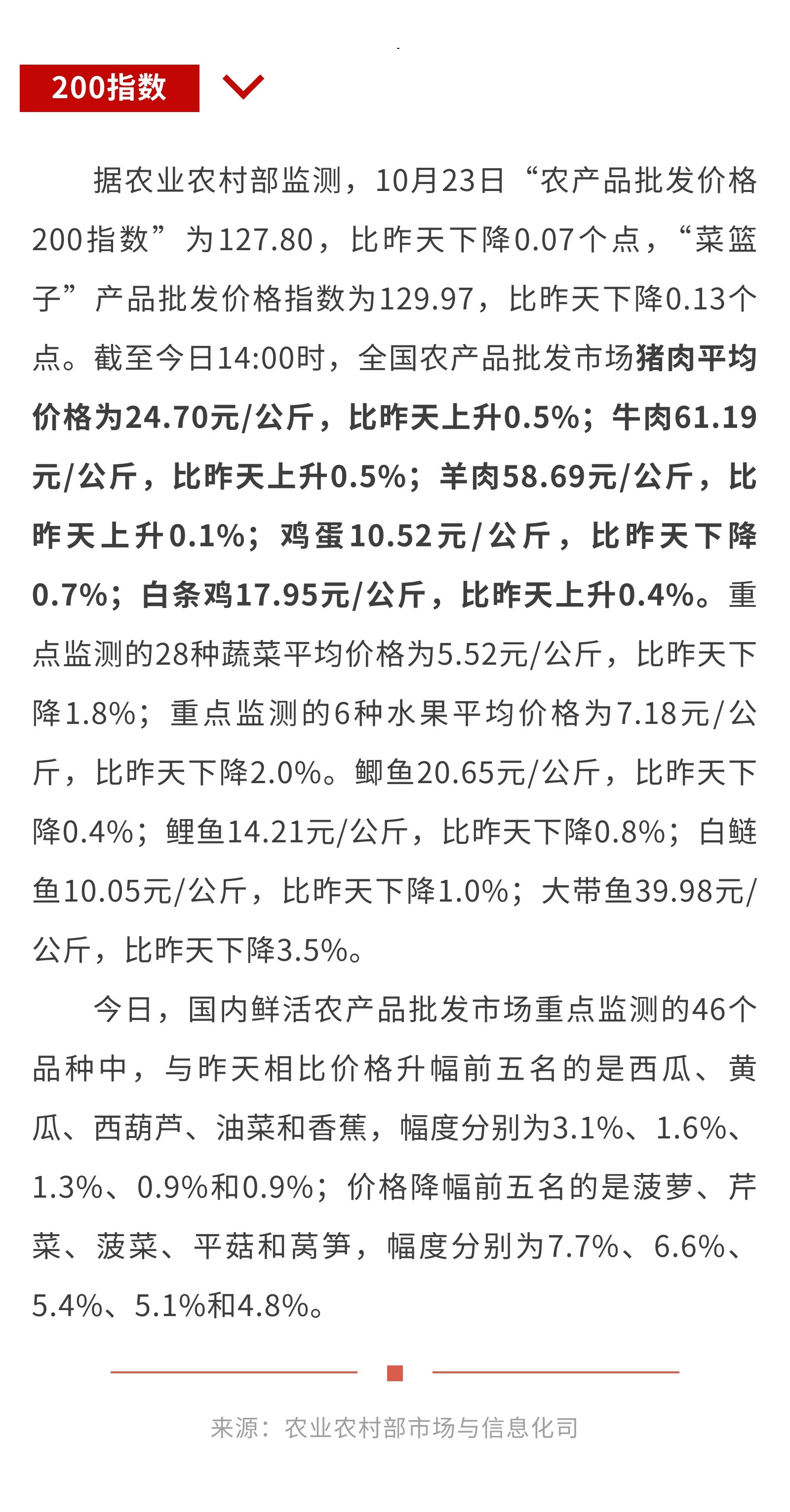 10月23日:“农产品批发价格200指数”比昨天下降0.07个点