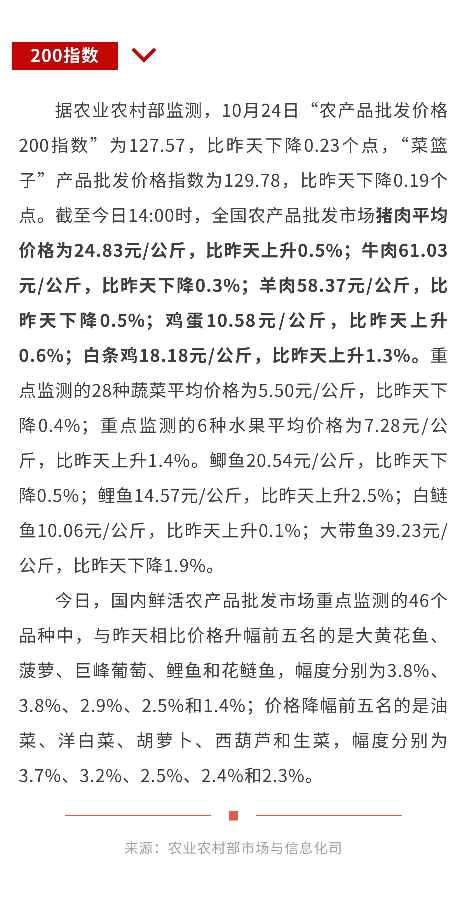 10月24日:“农产品批发价格200指数”比昨天下降0.23个点
