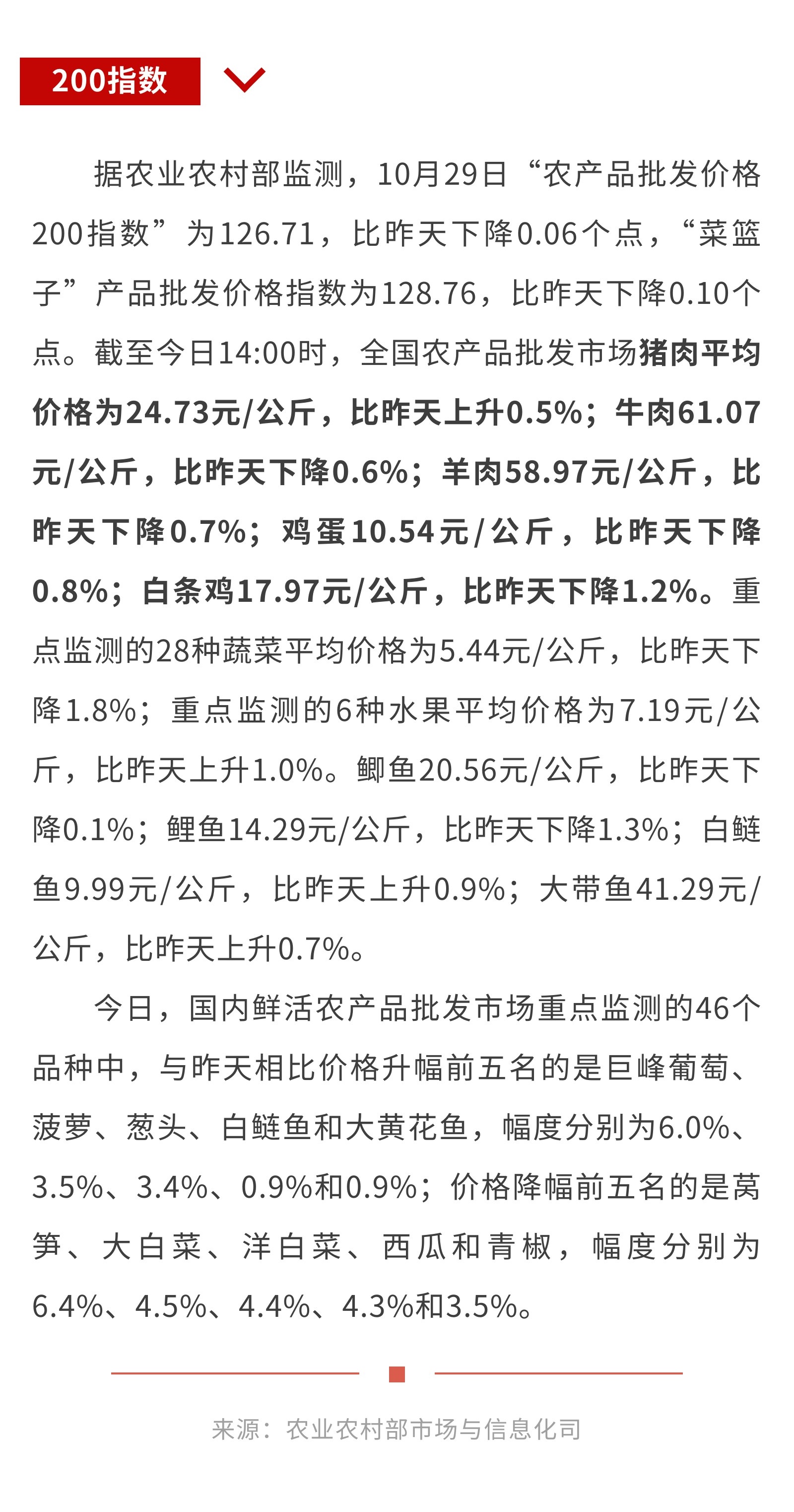 10月29日:“农产品批发价格200指数”比昨天下降0.06个点