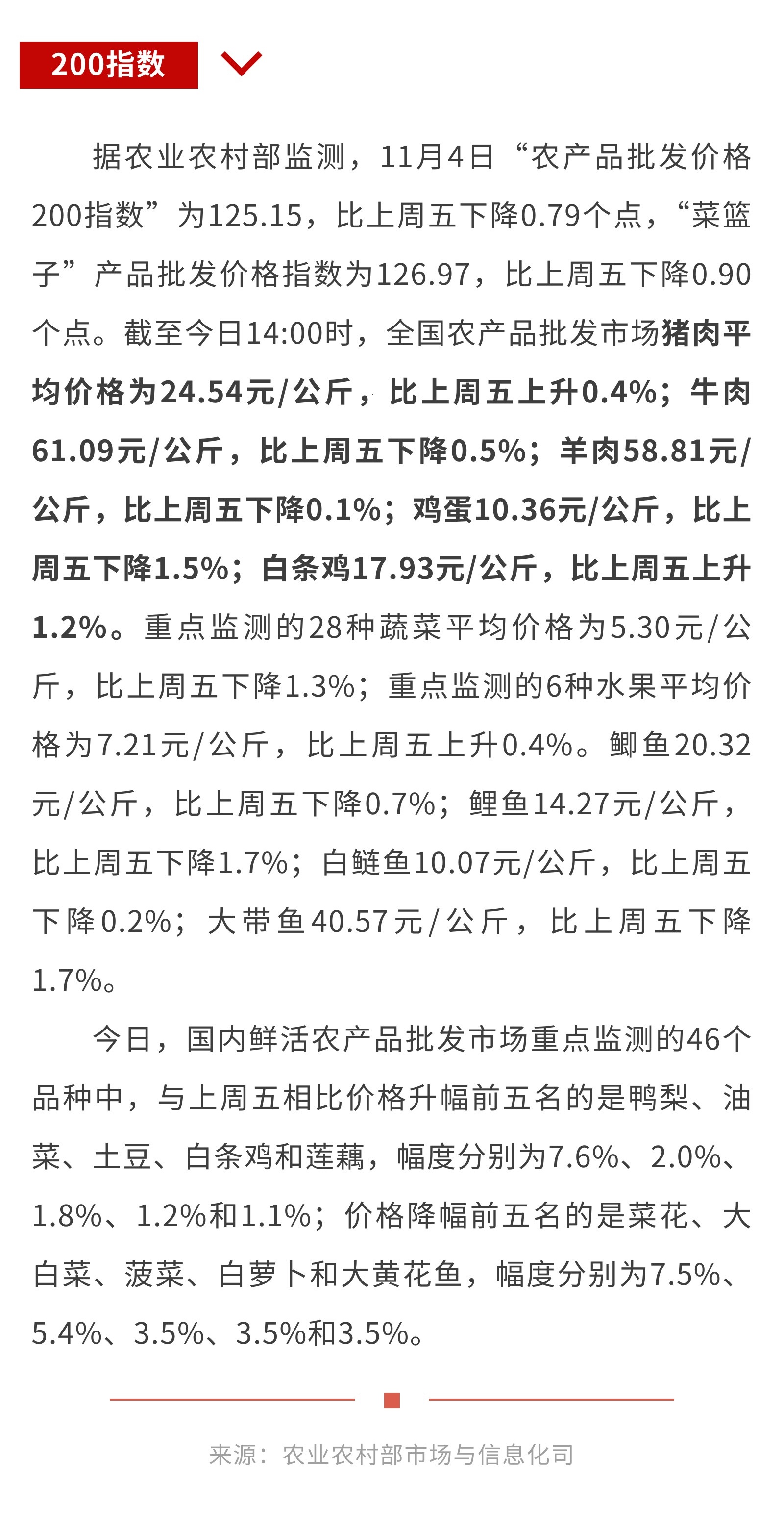 11月4日:“农产品批发价格200指数”比上周五下降0.79个点