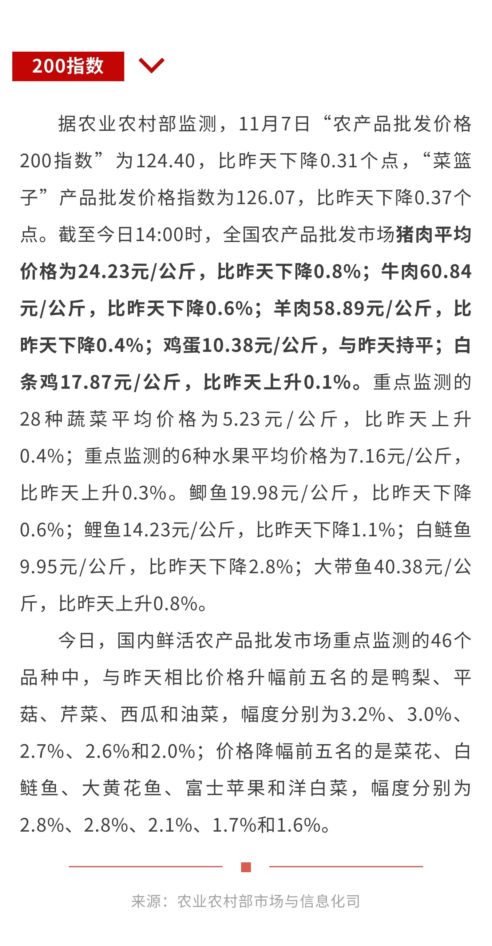 11月7日:“农产品批发价格200指数”比昨天下降0.31个点