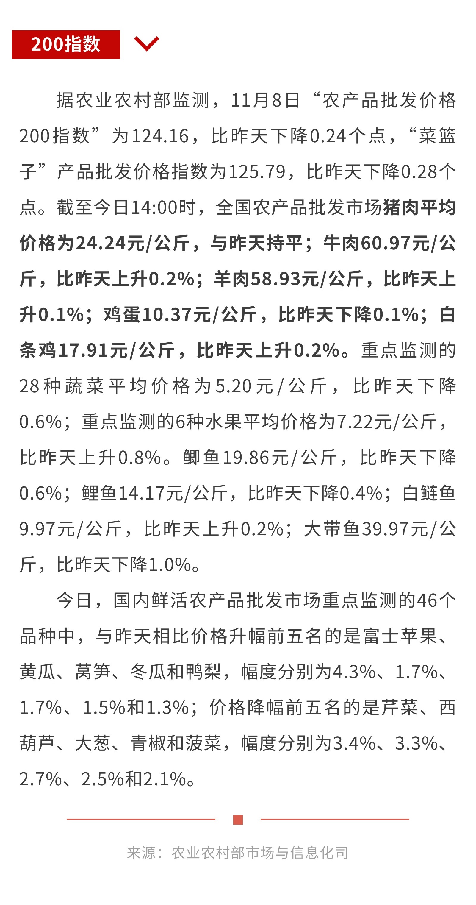 11月8日:“农产品批发价格200指数”比昨天下降0.24个点
