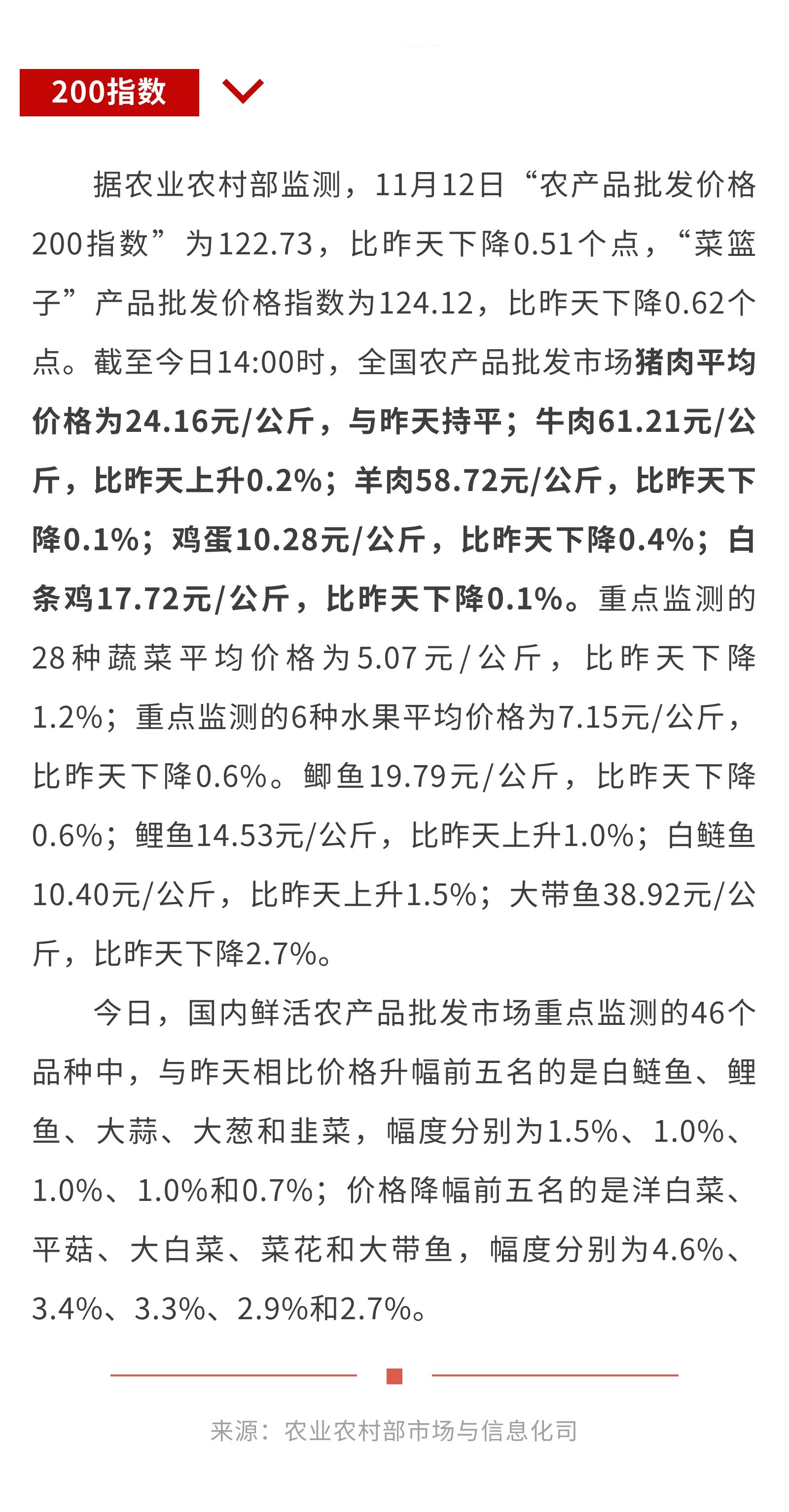 11月12日:“农产品批发价格200指数”比昨天下降0.51个点