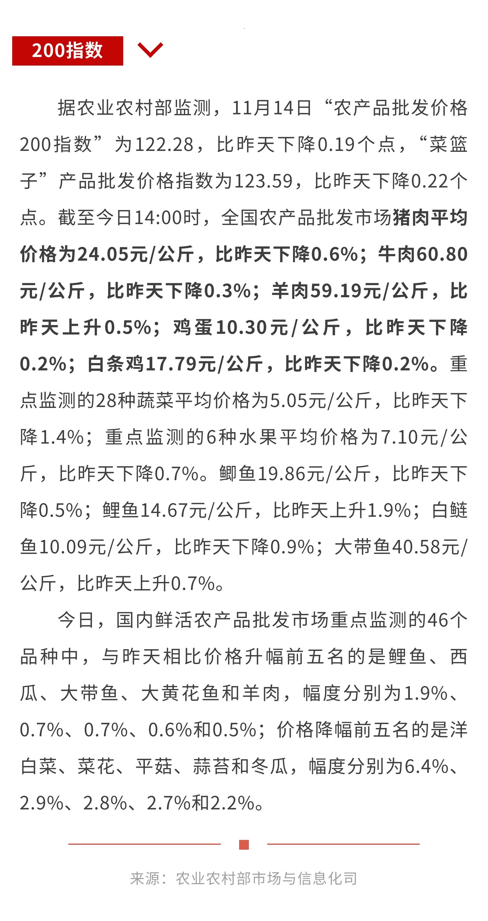 11月14日:“农产品批发价格200指数”比昨天下降0.19个点