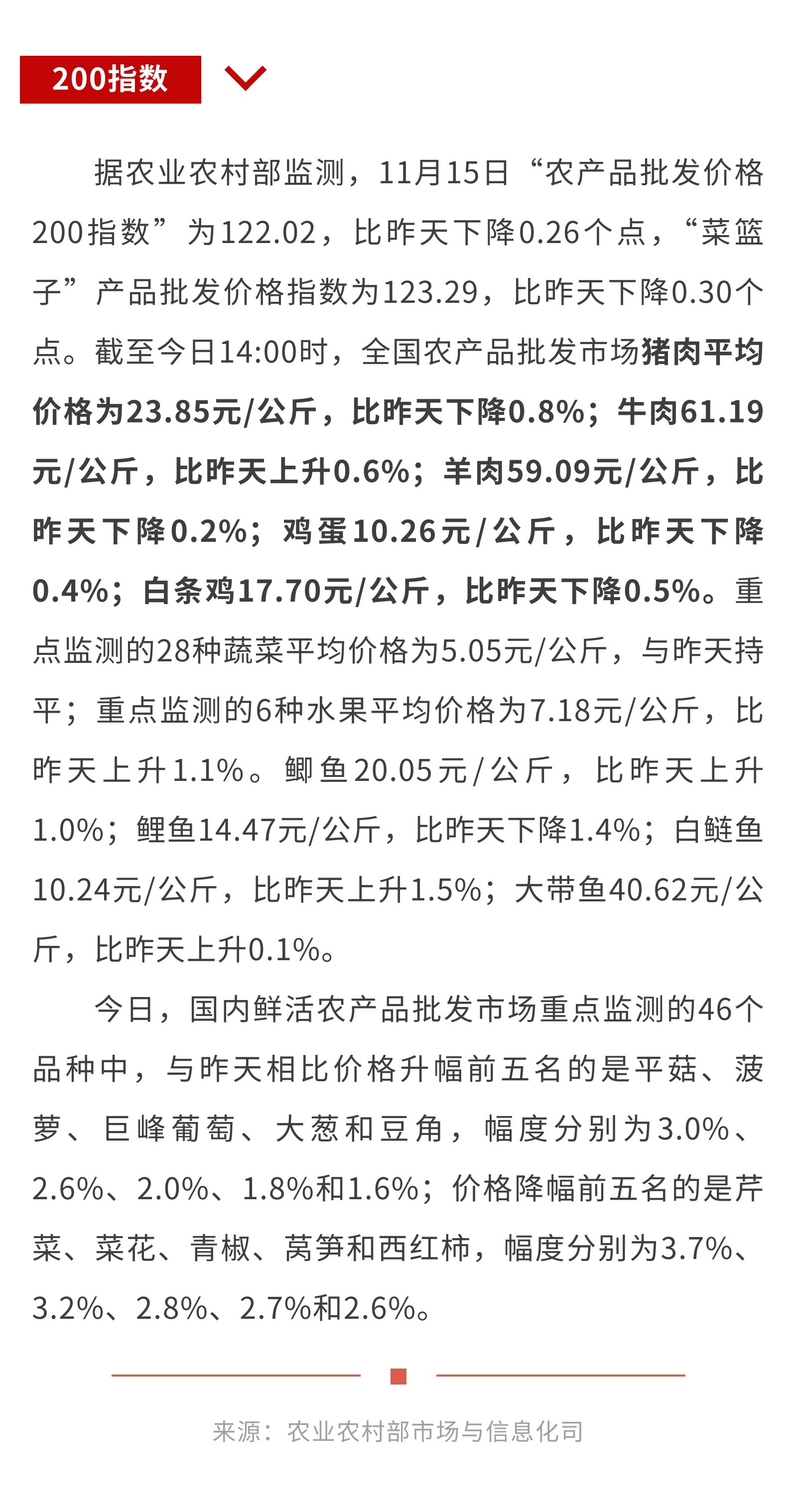 11月15日:“农产品批发价格200指数”比昨天下降0.26个点