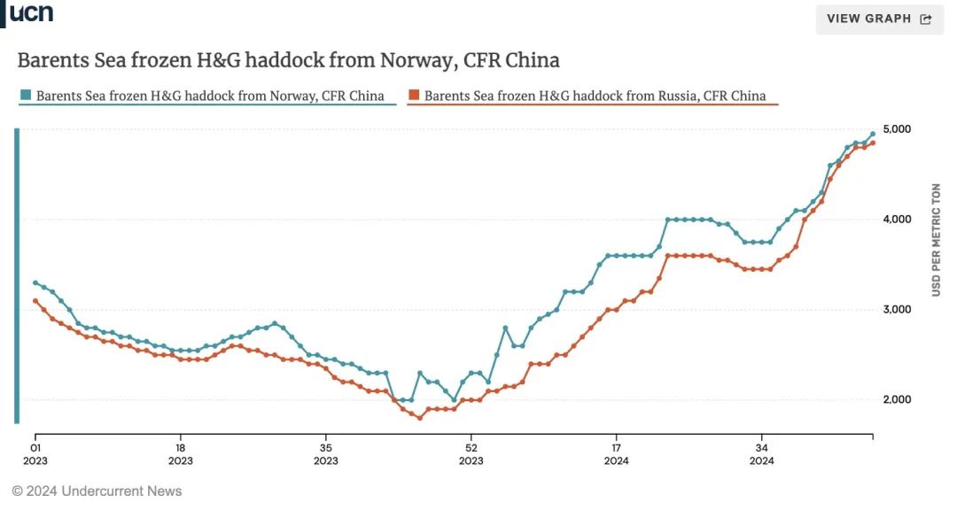 第47周(11月18-24日),俄罗斯与挪威真鳕和黑线鳕价格继续上涨,对下游市场施加了更大的压力。