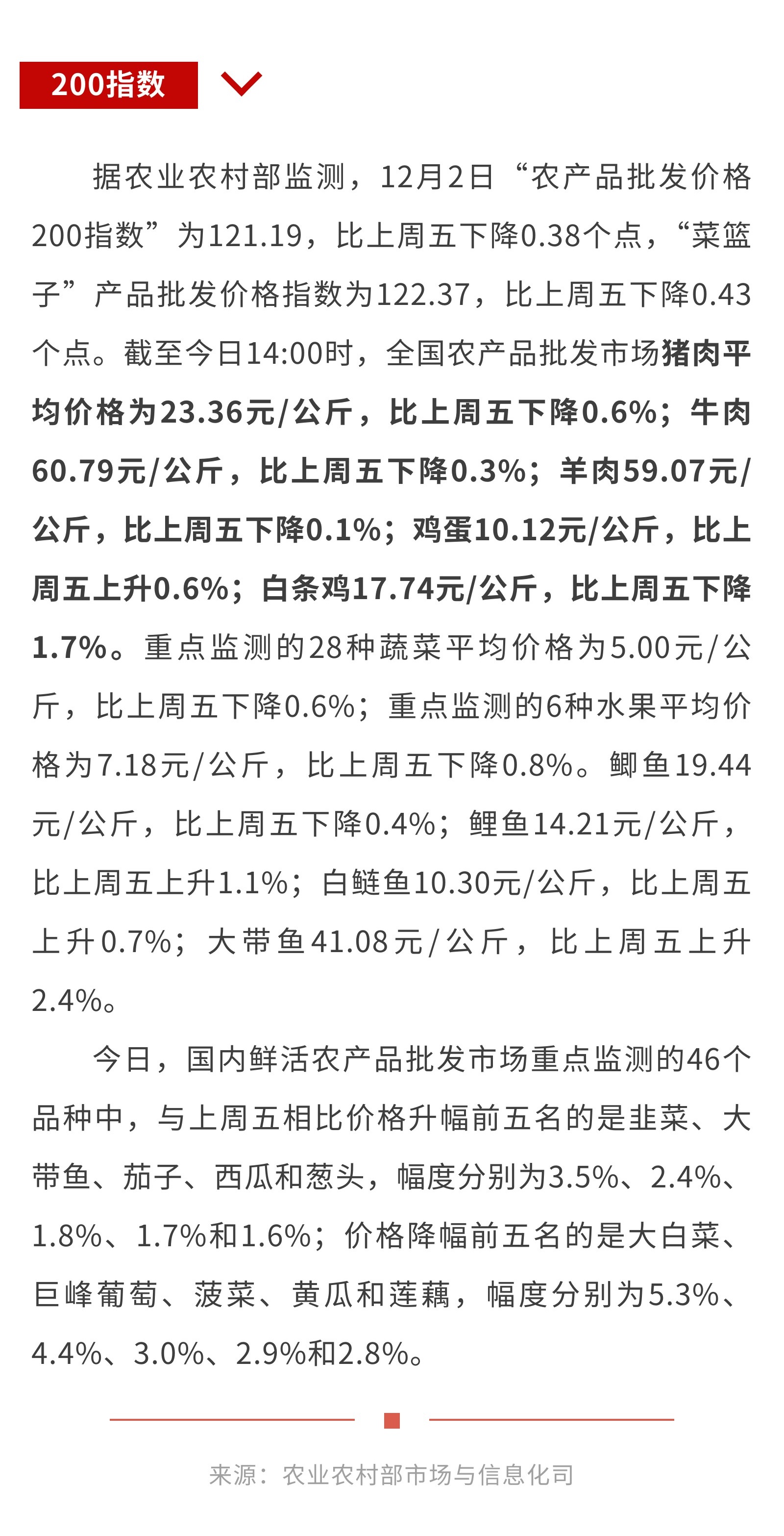 12月2日:“农产品批发价格200指数”比上周五下降0.38个点