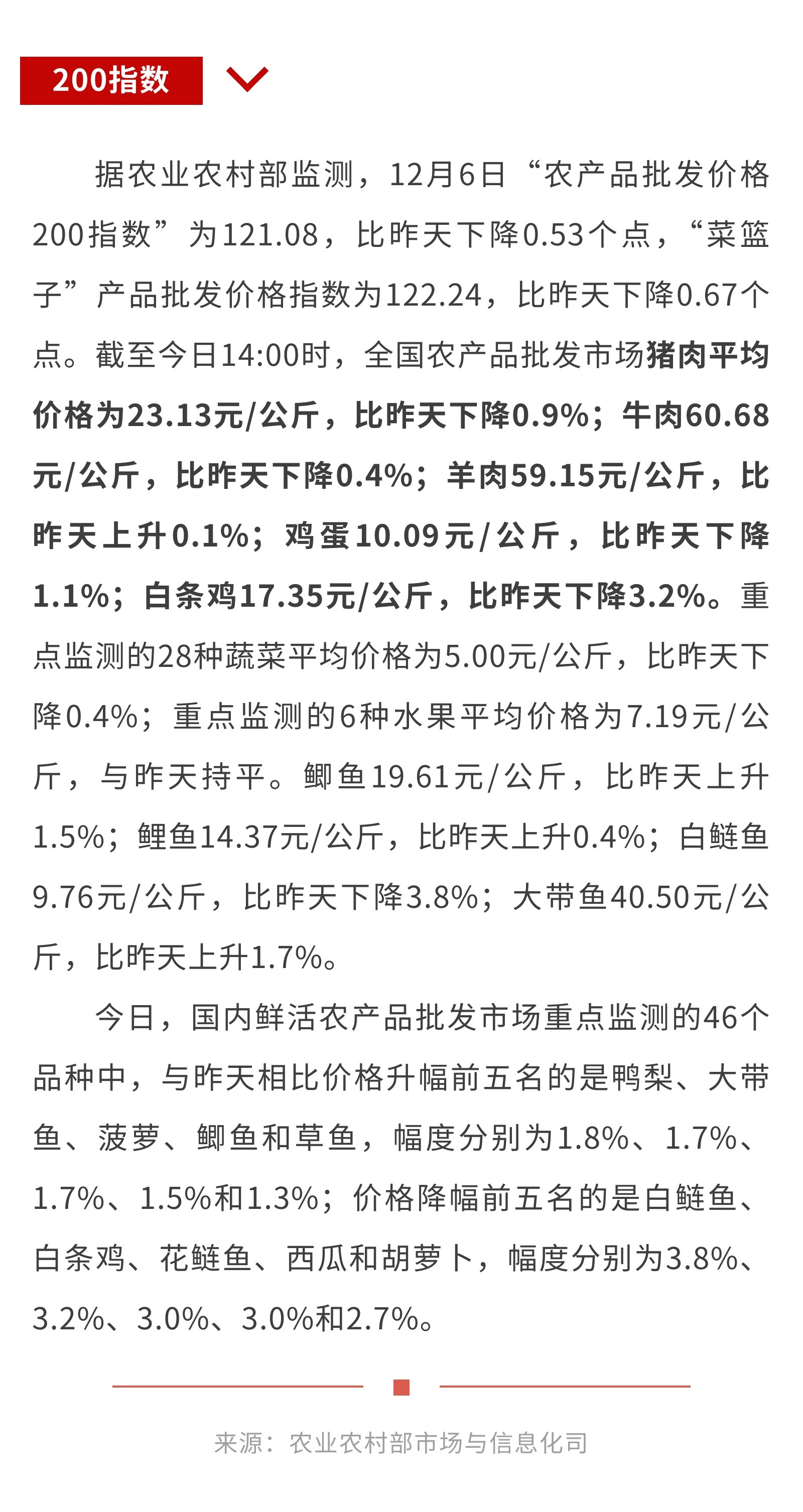 12月6日:“农产品批发价格200指数”比昨天下降0.53个点