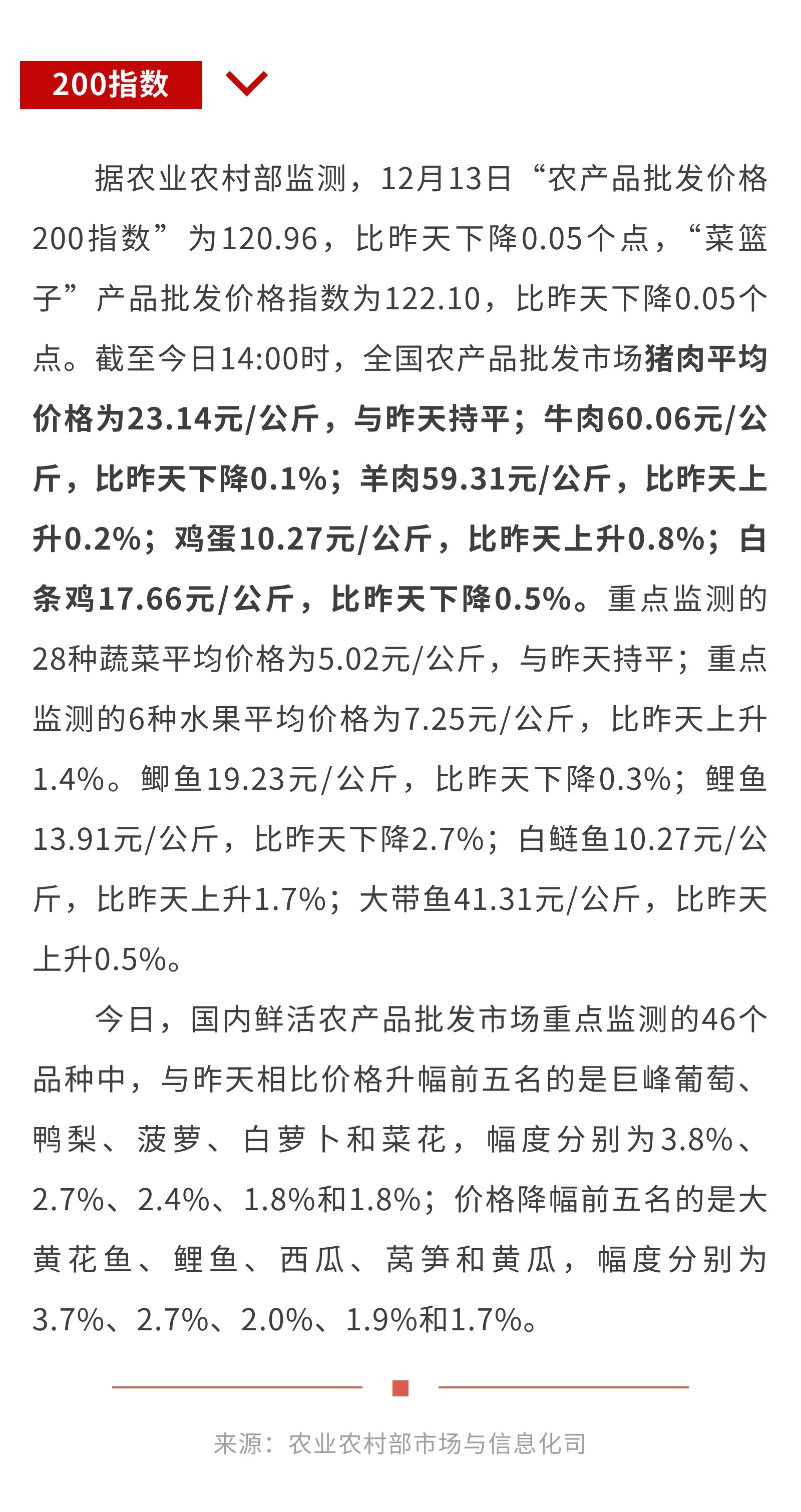 12月13日:“农产品批发价格200指数”比昨天下降0.05个点