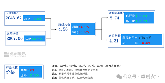 从周均价来看,本周蛋鸡产业链重点产品价格有涨有落,重点产品鸡蛋周均价为4.56元/斤,较上周均价环比涨幅1.33%;淘汰鸡周均价为5.74元/斤,较上周均价环比跌幅0.52%;鸡苗周均价为4.31元/羽,较上周均价环比涨幅0.47。成本方面,玉米周均价下跌1.12%,豆粕周均价下跌0.75%,饲料成本小幅走低,鸡蛋价格上涨,鸡蛋毛利润增多,增幅达6.16%,价格传导相对顺畅。