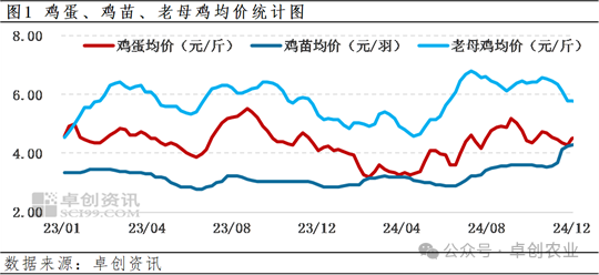 上周末蛋价涨至高位后,高价货源走货欠佳,经销商采购心态略显谨慎,市场走货放缓,价格小幅回落。但产区余货不多,蛋价小幅下跌后,经销商恢复正常采购,行情维持平稳运行。周内蛋价跌幅有限,周均价仍呈上涨走势。产区蛋价处于相对高位,市场高价货源销售不畅,下游贸易商入市采购量缩减,但随着产区蛋价稍有回落,下游适量采购低价货源,局部销区走货略有好转,周内销区蛋价窄幅震荡调整。上周末,老母鸡价格涨至阶段性高位,屠宰场和农贸市场对高价货源较为抵触,采购积极性不高,加之鸡蛋价格略显弱势,对老母鸡价格产生利空影响。养殖单位补栏心态转为谨慎,观望情绪渐浓,种鸡企业排单正常,供需处于僵持阶段,苗价再涨缺乏动力。目前种鸡企业鸡苗订单多数排至2025年2月下旬,少数排至3月中上旬,种蛋利用率多在80%-100%。