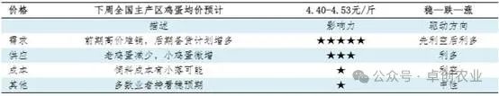 供应方面:前期产区出栏老母鸡较多,目前老鸡蛋供应量较少,后期新开产小鸡蛋微幅增加,鸡蛋质量改善,对价格有一定利多支撑。