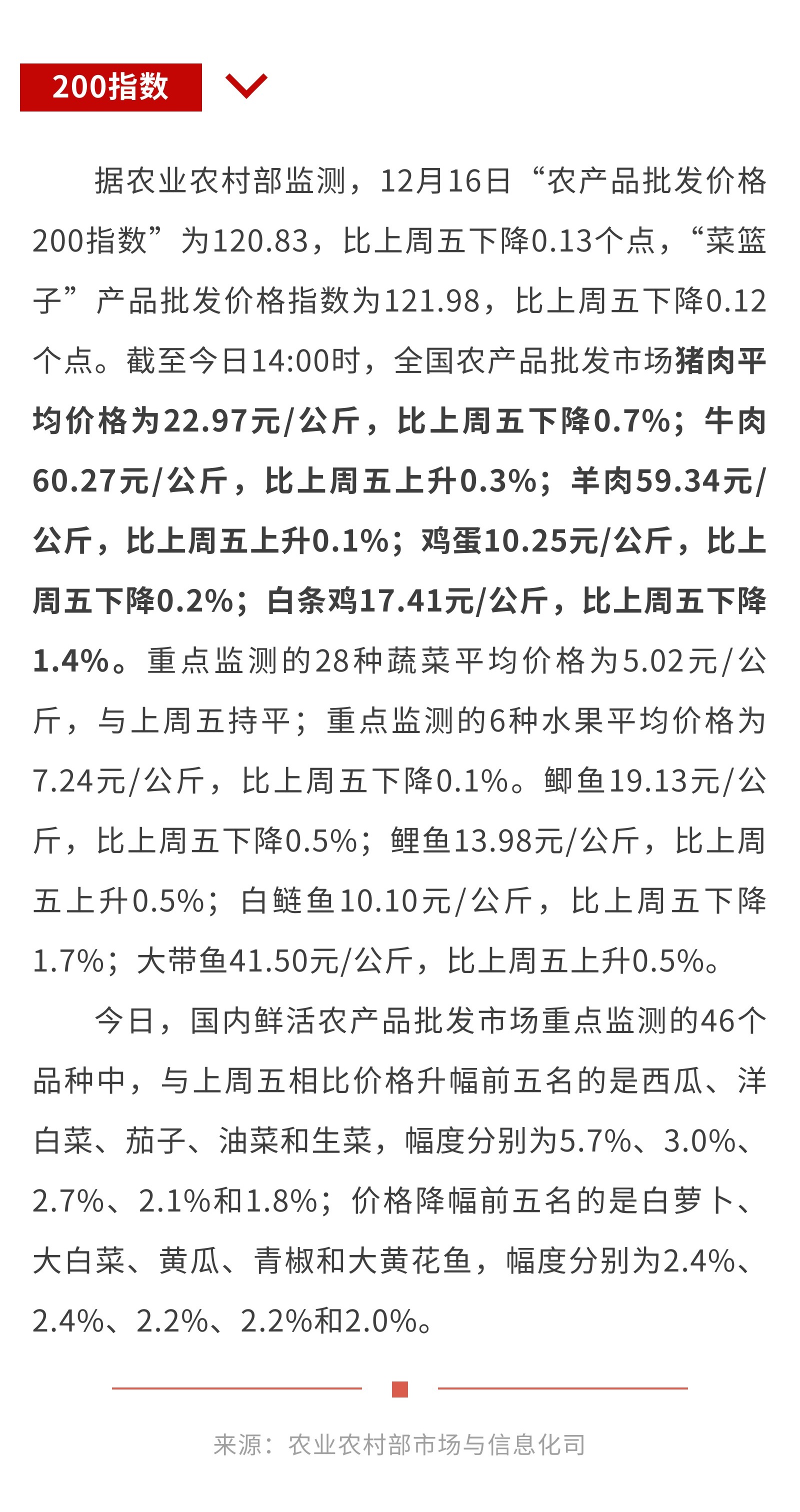 12月16日:“农产品批发价格200指数”比上周五下降0.13个点