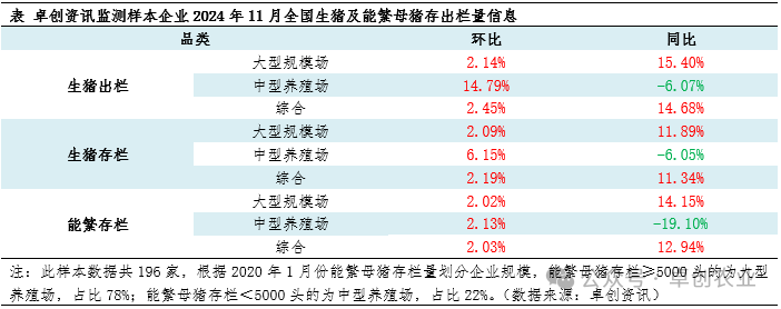 能繁母猪存栏:截至2024年11月末,卓创资讯监测196家样本企业能繁母猪存栏量893.7万头,较1月增加13.87%,同比增幅12.94%。2024年以来,能繁母猪存栏量自3月份开始增加,截至9月末已经连续增加6个月,仅9月底能繁母猪存栏环比由正转负,后续再度转为增加。经历2023年全年产能去化后,部分集团开始陆续恢复产能;加之2024年养殖盈利转正,集团补产能速度亦进一步加快,能繁母猪存栏在11月底达到年内最高水平。