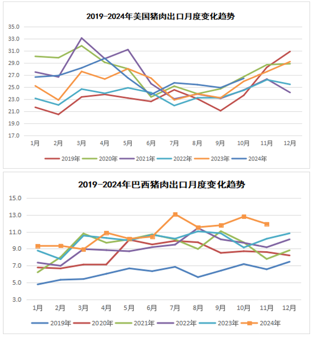 贸易方面,11月份,美国、巴西猪肉出口均同比增长。从美国看,11月份猪肉出口29.2万吨,同比增5.9%。其中,对华出口2.2万吨,同比增78.0%。1—11月猪肉出口293.4万吨,同比增4.8%。其中,对华出口18.8万吨,同比降13.0%。从巴西看,11月份猪肉出口11.9万吨,同比增17.3%。其中,对华出口2.1万吨,同比降17.2%。1—11月猪肉出口120.3万吨,同比增10.0%。其中,对华出口21.9万吨,同比降39.5%。