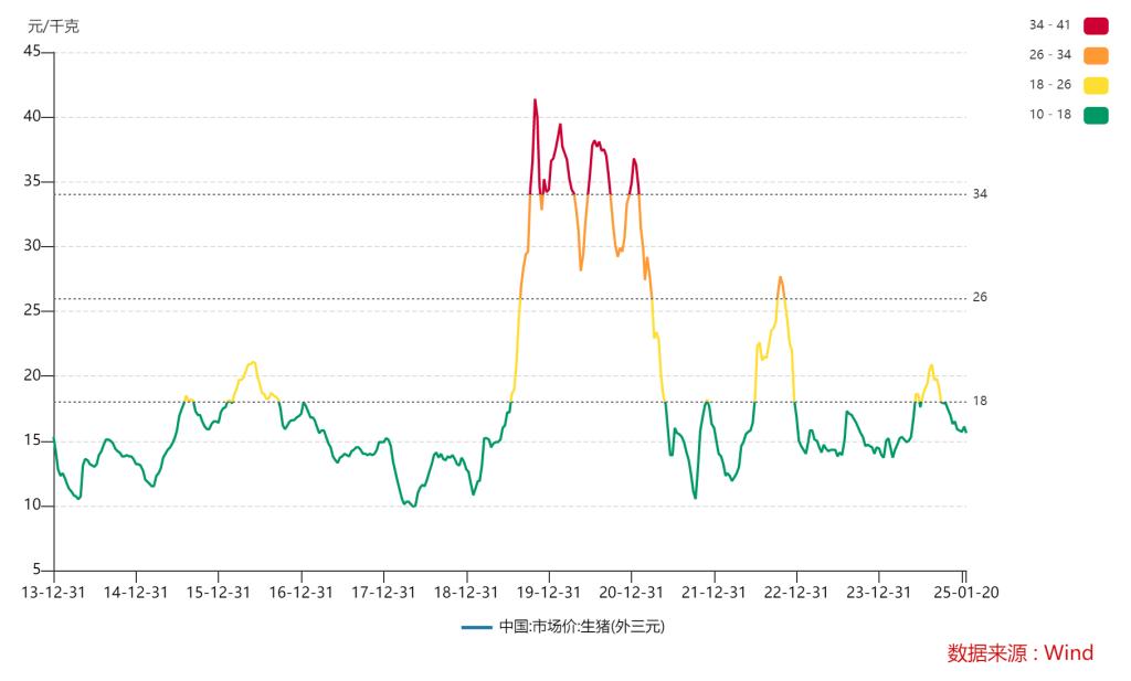 据国家统计局公布的数据,2024年1月上旬到5月中旬,生猪(外三元)价格始终徘徊在15元/公斤,5月下旬上涨到16.8元/公斤。此后继续震荡上扬,7月中旬上涨至19元/公斤,8月上旬涨至20.5元/公斤,8月中旬达到年内高峰20.9元/公斤。但局面并未维持太久,8月下旬下滑,9月下旬下滑至18元/公斤,11月上旬至17元/公斤,此后在15元/公斤-16元/公斤附近震荡。