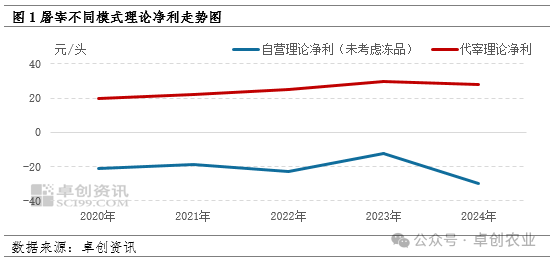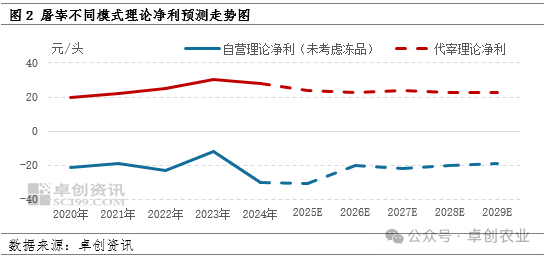 2020-2024年屠宰企业竞争加剧,利润水平低位震荡后再度下跌。代宰模式较自宰模式相对稳定,且利润空间相对较大,但两种模式目前阶段产能利用率均不高,内卷严重,进一步掣肘利润水平。预计未来5年仍或低位震荡。