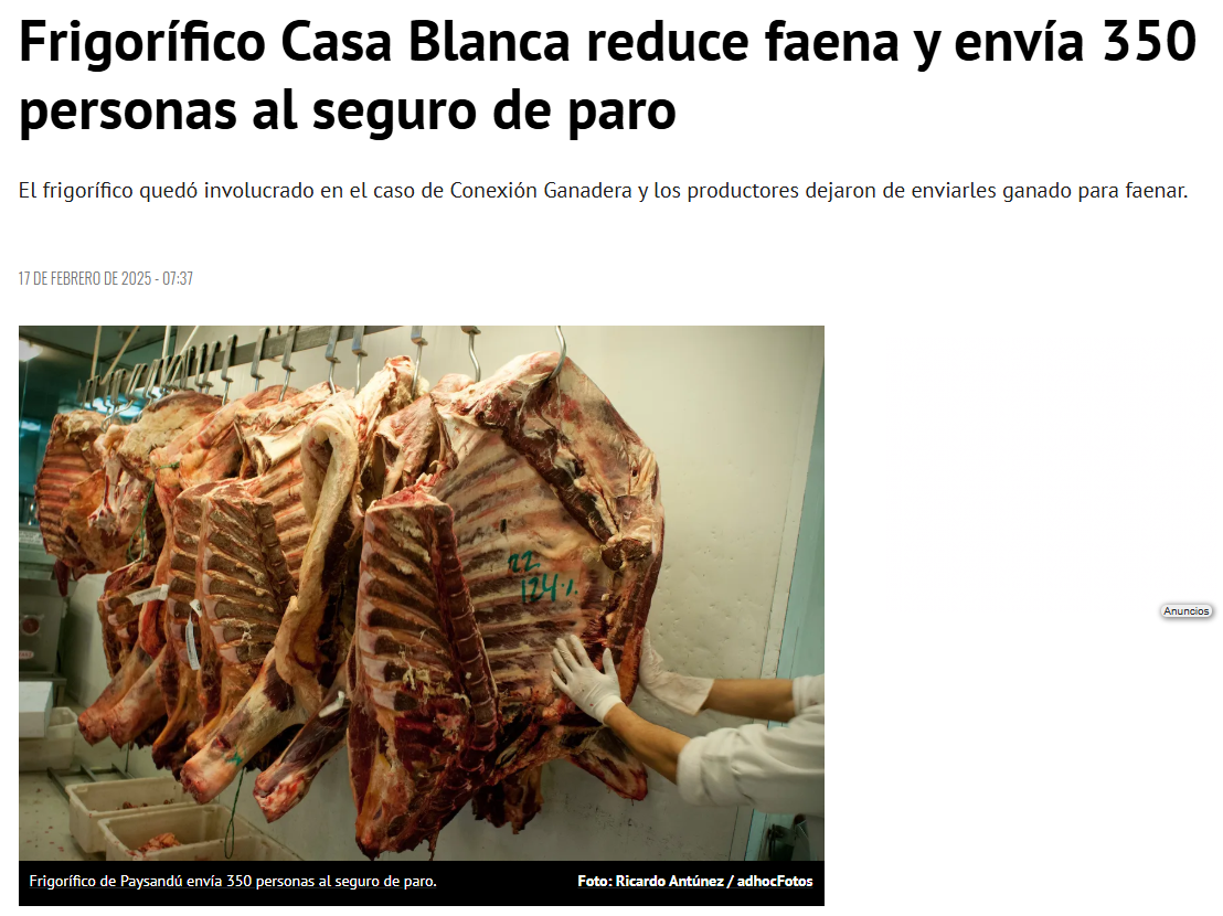 新闻原文: Frigorífico Casa Blanca reduce faena y envía 350 personas al seguro de paro El frigorífico quedó involucrado en el caso de Conexión Ganadera y los productores dejaron de enviarles ganado para faenar. Para el Frigorífico Casa Blanca (Fricasa), hay un antes y después del streaming de Conexión Ganadera, en donde Pablo Carrasco junto al doctor Ricardo Giovio informaron de la situación de la empresa. En las últimas horas se supo que el frigorífico Casa Blanca (Fricasa) de Paysandú envió a 350 trabajadores al seguro de paro debido a que mantenía una deuda de más de US$ 25 millones con Gustavo Basso, director de Conexión Ganaedera, quien murió el 28 de noviembre. Frente a esa situación la empresa decidió quedarse con una plantilla reducida a unos 80 trabajadores. Según informó el medio local El Telégrafo, tras conocer que el frigorífico había quedado involucrado en el caso de Conexión Ganadera, los productores decidieron dejar de enviarles ganado para faenar, reduciendo la producción de 1.000 a 1.200 reses por semana a no superar las 200 reses. En enero, durante el streaming de Conexión Ganadera, el director Pablo Carrasco y el contador de la empresa Ricardo Giovio revelaron la situación atenuante que atravesaba la empresa y, entre los datos que divulgaron, contaron que tenían US$ 45 millones en créditos a frigoríficos, US$ 27 millones de ellos correspondientes al frigorífico Casa Blanca. Exportaban a Estados Unidos, China y Chile El director del frigorífico, Carlos Mauro Fuidio Aguinaga, dijo días después que la deuda que se había generado en 20 años era de US$ 25,5 millones y no 27 millones y además indicó que el pasivo era prácticamente en la totalidad con Gustavo Basso y "no con Conexión Ganadera". "Esta situación, no cambia absolutamente en nada la realidad de Fricasa, ya que ese pasivo ya estaba contemplado en nuestro flujo mensual", había indicado. El director aclaró que el frigorífico seguía trabajando con normalidad y que la deuda no cambiaba "nada", sin embargo, y pese a las aclaraciones de Fuidio, los productores decidieron retirar el ganado, dejando a Fricasa en un estado delicado. "Mientras tanto, iremos buscando soluciones a todo nivel, para poder recuperar nuestra actividad normal lo más rápido posible", dijeron desde la empresa a El Telégrafo. El frigorífico Casablanca tenía contratos de exportación con Estados Unidos, China y Chile. 翻译整理: 近日,乌拉圭知名的输华牛肉加工厂58厂(Frigorífico Casa Blanca S.A.)陷入了严重的财务困境,并采取了裁员措施以应对当前的危机。这一消息引起了业界的广泛关注。 据悉,该厂位于乌拉圭派桑杜地区,是乌拉圭重要的牛肉出口企业之一。然而,由于拖欠已故畜牧产业链平台负责人古斯塔沃·巴索超过2550万美元的债务,该厂的经营状况急转直下。为了缓解财务压力,该厂不得不将350名员工纳入失业保险,并将员工规模缩减至约80人。这一裁员决定对当地就业市场造成了不小的冲击。 自该厂卷入畜牧产业链案件后,养殖户们纷纷停止向其供应屠宰牲畜。这一举措导致该厂的周屠宰量从之前的1000至1200头骤降至不足200头,严重影响了其生产能力和出口业务。据了解,该厂此前一直保持着对美国、中国和智利等国的出口业务,而此次危机无疑对其国际市场份额造成了打击。 来源:乌拉圭Caras y Caretas 整理:编辑罗艳叶 发布时间:2025年2月17日 07点37分