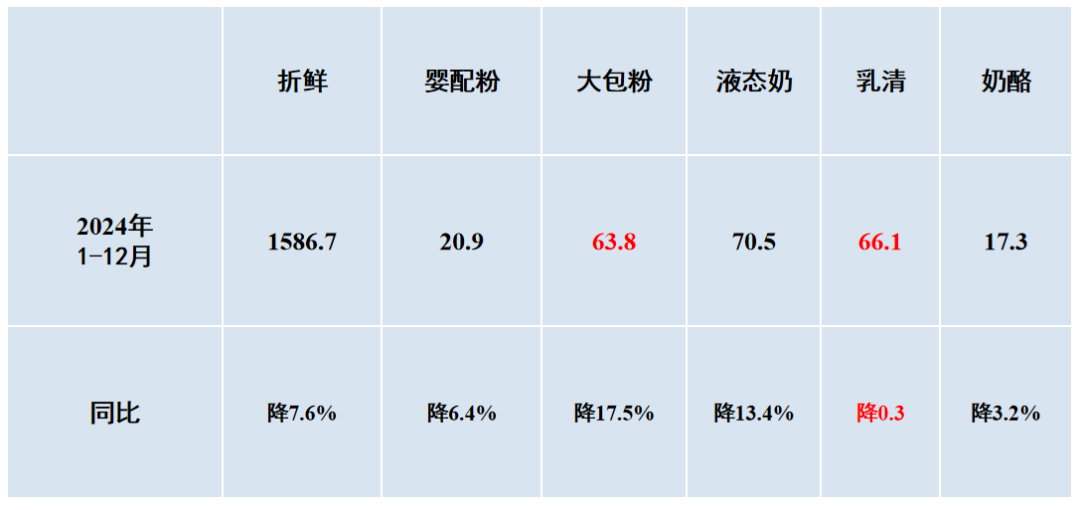 1—12月,进口各类乳制品261.6万吨,同比降9.0%,折合生鲜乳1586.7万吨,同比降7.6%(干制品按1:8,液态奶按1:1折算);进口额112.3亿美元,同比降6.9%。