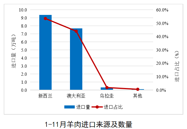 4.羊肉进口下降。1—12月,进口羊肉36.6万吨,同比降15.5%;进口额11.9亿美元,同比降32.8%。进口主要来自澳大利亚、新西兰和乌拉圭,分别占进口总量的52.1%、45.7%和1.5%,合计占99.3%,同比分别降3.9%、23.2%和59.5%。