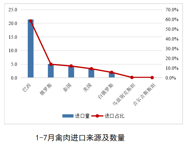 2.禽肉产品进口减少、出口增加。1—12月,禽肉及杂碎进口94.9万吨,同比降27.2%;进口额29.5亿美元,同比降29.4%。其中,禽肉进口40.5万吨,同比降40.7%;进口额11.5亿美元,同比降33.9%。主要来自巴西、俄罗斯、泰国、美国和白俄罗斯等国,分别占进口总量的58.8%、15.3%、12.5%、6.4%和5.6%,合计占比98.6%,其中,从巴西、泰国、美国和白俄罗斯进口分别同比下降17.8%、2.0%、74.9%和22.4%,从俄罗斯进口同比增5.4%。1—12月,禽肉及杂碎出口50.8万吨,同比增58.5%;出口额10.4亿美元,同比增26.0%;加工禽肉出口41.2万吨,同比增18.4%;出口额15.6亿美元,同比增12.1%。