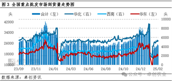 本月国内重点批发市场到货量呈“跌后缓增”的走势。卓创资讯监测2月全国重点批发市场日均到货量2.23万头,环比下降34.60%。春节假期结束后,部分市场仍暂未开市,仅部分经销商少量拿货运营;元宵节后,市场与经销商全面开工,但此时家庭消费增量有限,餐饮需求量一般,市场成交活力平平,经销商拿货亦较为谨慎,到货量缓慢增加。