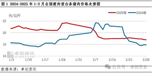 春节结束后,猪肉价格呈现震荡缓跌的情况。卓创资讯数据监测显示,截至2月28日,全国瘦肉型白条猪肉均价为19.23元/公斤,环比下滑7.52%,同比下滑1.74%。节后,终端需求较春节前明显下滑,养殖、屠宰企业陆续复工,市场供大于求,猪肉价格下跌;而后随着学校开学、终端家庭需求缓慢恢复,供需博弈,价格出现缓跌。