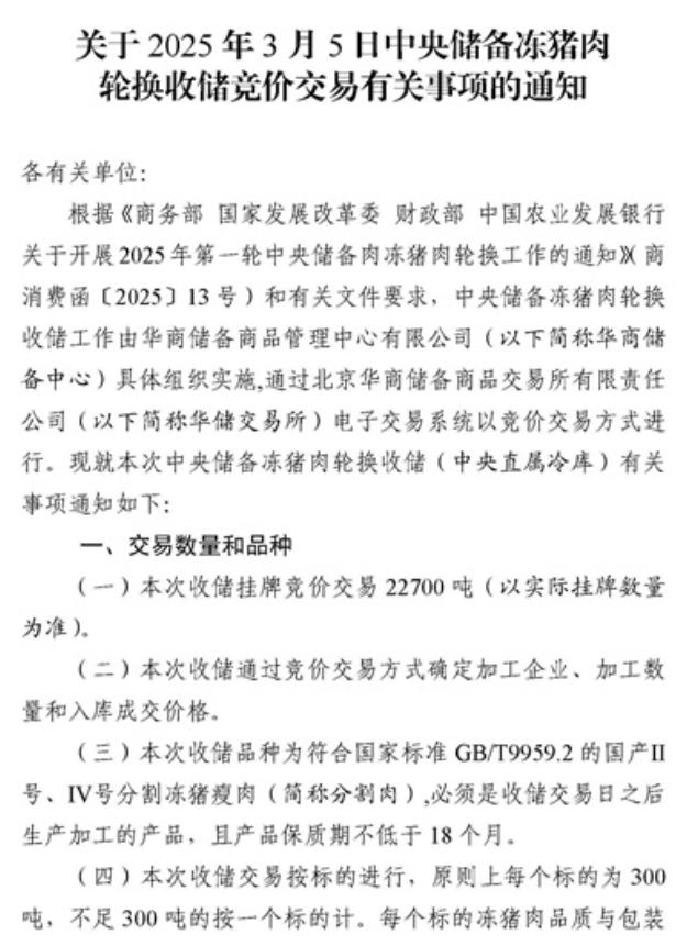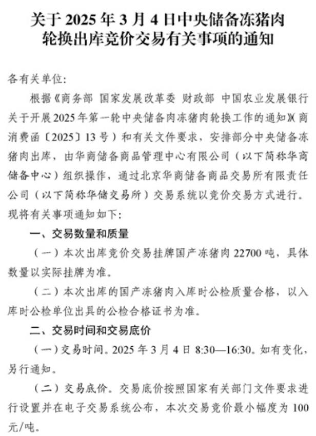 2月28日,华储网分别发布关于2025年3月4日和5日中央储备冻猪肉轮换出库和收储竞价交易有关事项的通知。