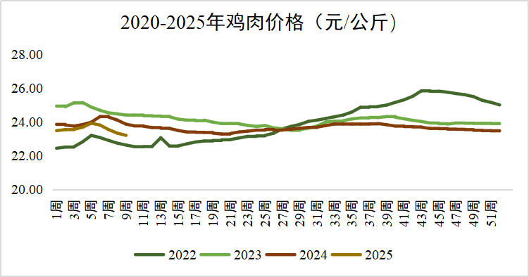 鸡肉价格延续跌势:2025年2月第4周全国鸡肉平均价格23.20元/公斤,环比下跌0.6%,同比下跌2.8%。商品代蛋雏鸡平均价格4.13元/只,环比上涨0.2%,同比上涨12.5%。商品代肉雏鸡平均价格3.40元/只,环比上涨0.6%,同比下跌2.0%。