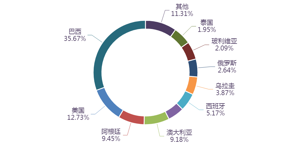 市场方面,前12个月,我国肉类及制品进口额排名前十的国家/地区分别为巴西、美国、阿根廷、澳大利亚、新西兰、西班牙、乌拉圭、俄罗斯、玻利维亚、泰国,合计占我国该产品进口额的88.69%。