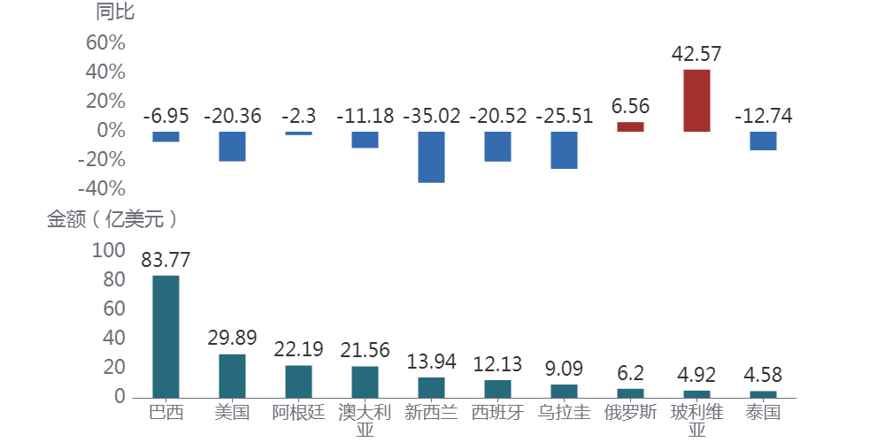 前12个月,巴西是我国肉类及制品进口最主要的市场,进口额为83.77亿美元,同比下降6.95%。12月当月,进口额为9.24亿美元,同比增长16.89%。