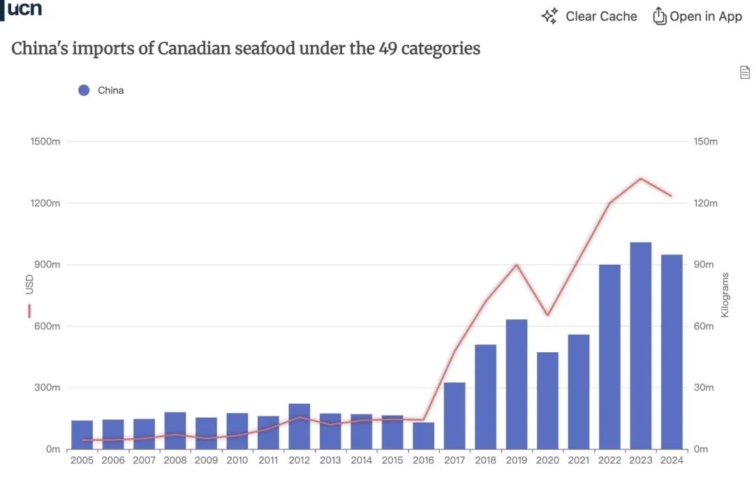 2025年3月20日起,中国将对原产于加拿大的部分进口商品加征关税,海产品税率为25%,适用于49款商品,包括格陵兰比目鱼、蟹类、波士顿龙虾、冷水虾和贝类。