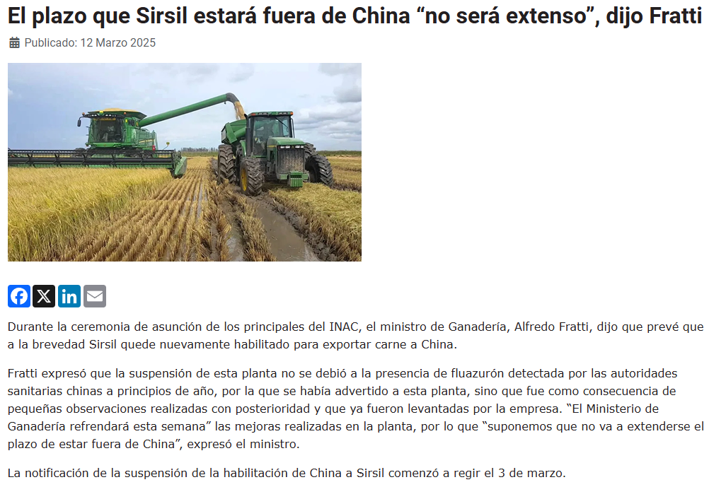 此前,中国海关总署于 3 月 3 日发布通知,暂停接受乌拉圭 85 厂自当日起启运的牛肉产品进口申报。最初,外界猜测这一暂停与年初该厂输华牛肉中被检测出氟佐隆(fluazuron)药残有关,工厂在 1 月初也曾收到相关警告。然而,Alfredo Fratti部长澄清,此次暂停实则源于后续对该厂生产过程进行远程审计时,发现了一些小的不合规情况。
