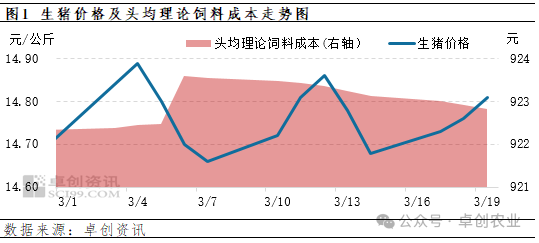 3月份所出栏的生猪,其价格频繁震荡,而头均理论饲料成本变动较小。根据卓创资讯监测,截至19日,3月份全国生猪均价14.77元/公斤,与2月同期水平相比下降0.11元/公斤,降幅0.71%;月内最高点为4日的14.89元/公斤,最低点为7日的14.66元/公斤。头均理论饲料成本月均值为923.07元,与2月份同期水平相比增加6.09元,涨幅0.66%;月内最高点为6日的923.60元,最低点为3日的922.39元。