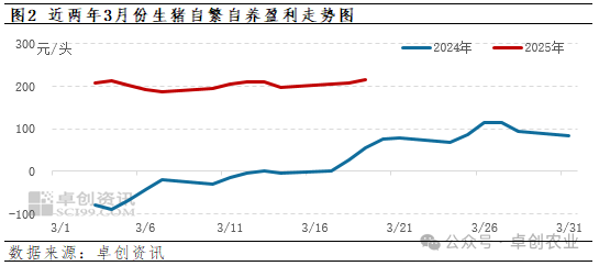 虽生猪价格环比微跌,但由于生猪交易均重上涨,因此生猪养殖收入呈微增状态,卓创资讯测算3月份生猪养殖收入均值1836.87元/头,环比微增0.18%。但由于养殖收入及成本变化均较为微弱,因此生猪自繁自养盈利变动情况亦较为微弱。