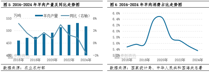导致羊肉价格下跌的主因有两方面。供应来看,高盈利影响下养殖端积极扩产,叠加近些年肉羊育种、饲养、屠宰技术的不断进步,出肉率上升,2016-2023年全国羊肉产量持续上升。2024年虽有所回落,但幅度有限,长周期处于偏高水平,年内羊肉供应较为充裕。需求来看,大趋势下羊肉消费虽向好,但2024年作为羊肉替代品的猪肉、牛肉及禽肉价格皆偏低,下游食品加工厂、餐饮等行业对羊肉的采购意愿减弱。因此从图6看到,2020年以来羊肉在肉类消费中的占比持续下降。