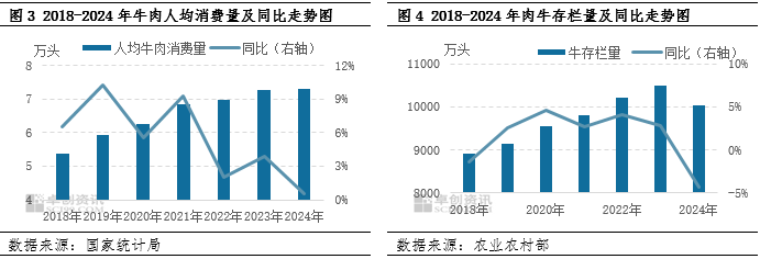 需求方面,随着生活水平的提升,膳食健康的需求越来越高,同时受主力消费人群转移以及居民消费结构优化等因素影响,居民对牛肉的需求不断上升。从图3看到,2018-2024年牛肉人均消费量整体呈现持续上涨的态势,但受替代品猪肉、禽肉价格偏低冲击,增幅逐渐放缓,至2024年消费增幅仅在0.55%。