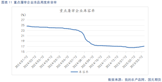 截止3月25日,重点屠宰企业开工率为26.55%,较上季度末下降11.19%。冷冻肉库容率16.91%,较上周环比上升0.1%。春节前,终端备货需求支撑下,开工率维持较高水平,小年前后达至峰值50.45%。春节期间屠企停工,节后屠企陆续开工,受返工返校后,需求逐步回暖。不过整体需求已步入季节性淡季,居民消费不足,屠企以销定宰,开工率回升缓慢,较节前峰值降幅明显。节后随着开工返校,开工率逐步回升,不过需求步入季节性淡季,开工率回升缓慢。淡季市场,鲜肉价格偏低,对冻肉需求较小,冻品去库缓慢。加之白条走货缓慢,屠企分割入库情况增多,冻肉库存节后开始小幅回升。不过经历了24年三四季度的去库存,当前冻肉库存压力不大。