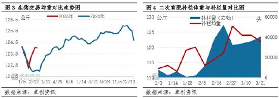 且从当下生猪出栏均重、收购均重与体重差数据对比显示,截至3月20日,生猪出栏均重为125.02公斤,收购均重为124.73公斤,收购均重减去出栏均重的体重差呈现负值走阔。按照下游市场季节性变化规律,4月气温稳步升高,屠企收购均重下滑,部分企业对中大猪加大扣罚,或推动大猪出栏意愿提升,也会导致供应量增幅超预期。