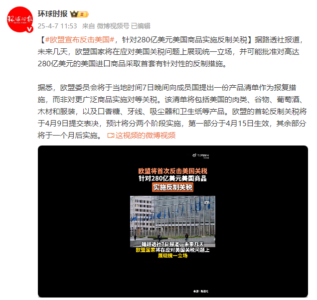 外媒:欧盟将首次反击,可能批准对280亿美元美国商品实施反制关税