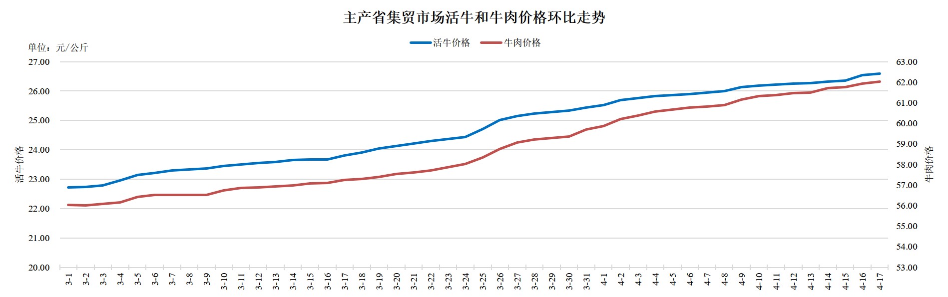 据农业农村部监测,2025年4月17日,主产省集贸市场活牛价格26.60元/公斤,同比上涨6.7%,环比上涨0.2%,自3月2日起连续上涨47天,累计上涨3.88元,涨幅17.1%;牛肉价格62.02元/公斤,同比下跌3.9%,环比上涨0.1%,自3月2日起震荡上行,累计上涨5.99元,涨幅10.7%。