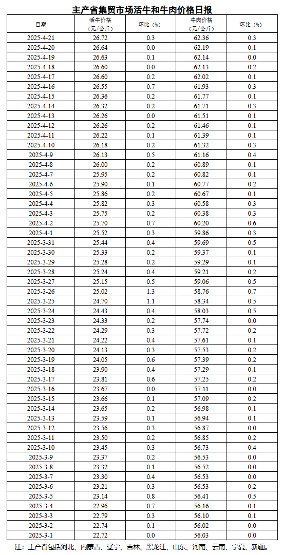4月21日主产省集贸市场活牛和牛肉价格环比均上涨0.3%