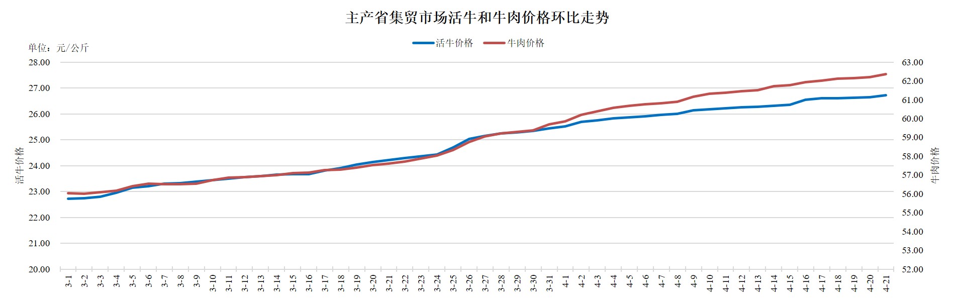 据农业农村部监测,2025年4月21日,主产省集贸市场活牛价格26.72元/公斤,同比上涨8.6%,环比上涨0.3%,自3月2日起连续上涨51天,累计上涨4元,涨幅17.6%;牛肉价格62.36元/公斤,同比下跌2.8%,环比上涨0.3%,自3月2日起震荡上行,累计上涨6.32元,涨幅11.3%。