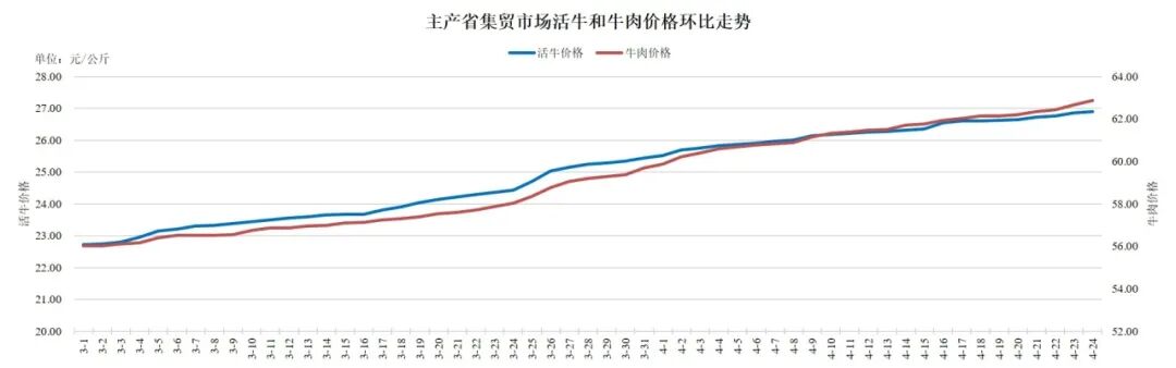 4月24日主产省集贸市场活牛和牛肉价格环比分别上涨0.2%、0.3%