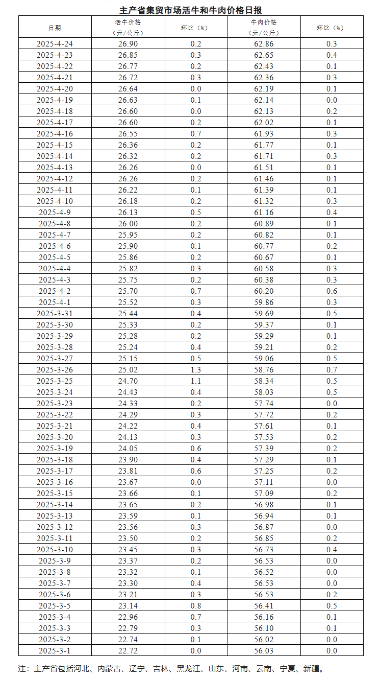 据农业农村部监测,2025年4月24日,主产省集贸市场活牛价格26.90元/公斤,同比上涨10.4%,环比上涨0.2%,自3月2日起连续上涨54天,累计上涨4.19元,涨幅18.4%;牛肉价格62.86元/公斤,同比下跌1.3%,环比上涨0.3%,自3月2日起震荡上行,累计上涨6.82元,涨幅12.2%。