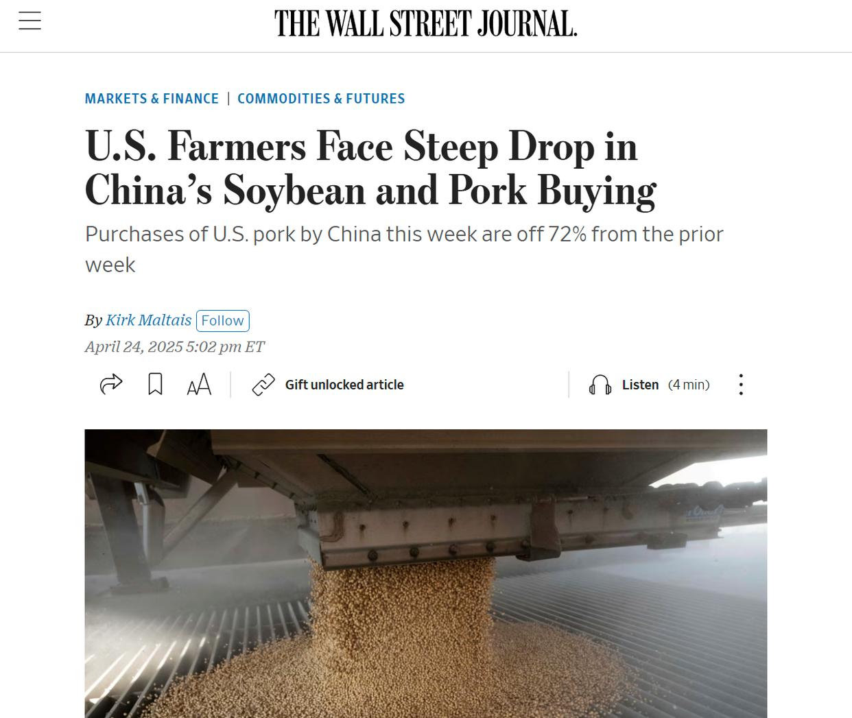 据美国《华尔街日报》24日报道,特朗普政府发起的“全球贸易战”打击了美国农作物和肉类的海外需求。美国农业部最新公布的出口数据显示,中国采购美国大豆的数量锐减,并缩减了在2025年进口美国猪肉的计划。