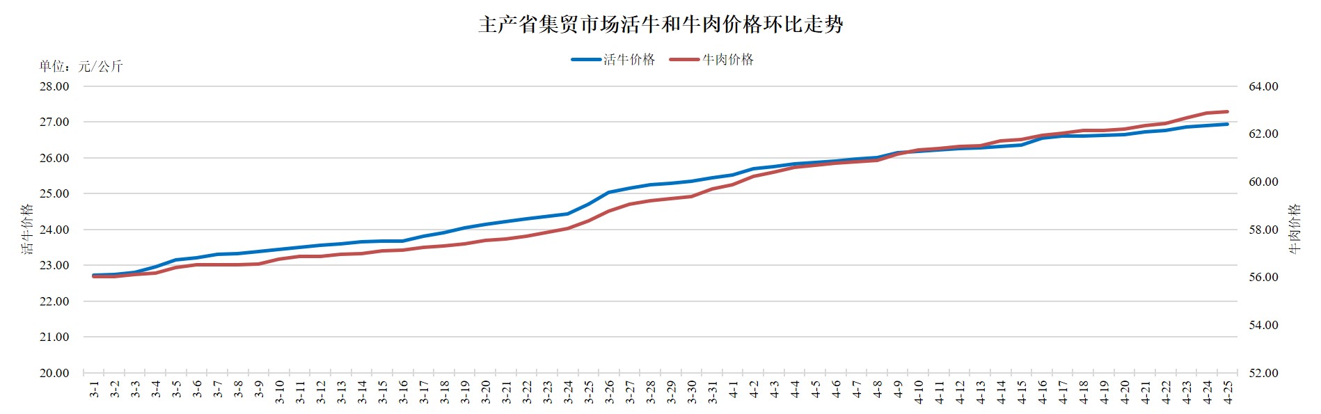 据农业农村部监测,2025年4月25日,主产省集贸市场活牛价格26.92元/公斤,同比上涨10.9%,环比上涨0.1%,自3月2日起连续上涨55天,累计上涨4.21元,涨幅18.5%;牛肉价格62.93元/公斤,同比下跌0.9%,环比上涨0.1%,自3月2日起震荡上行,累计上涨6.89元,涨幅12.3%。